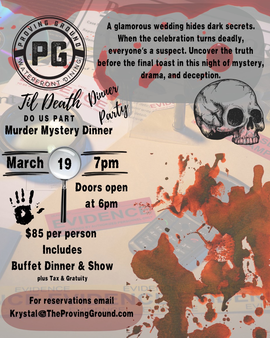Til Death do us part Murder Mystery themed dinner party. Enjoy a dinner buffet and show for $85 per person (plus tax and gratuity). Doors open at 6:00pm!