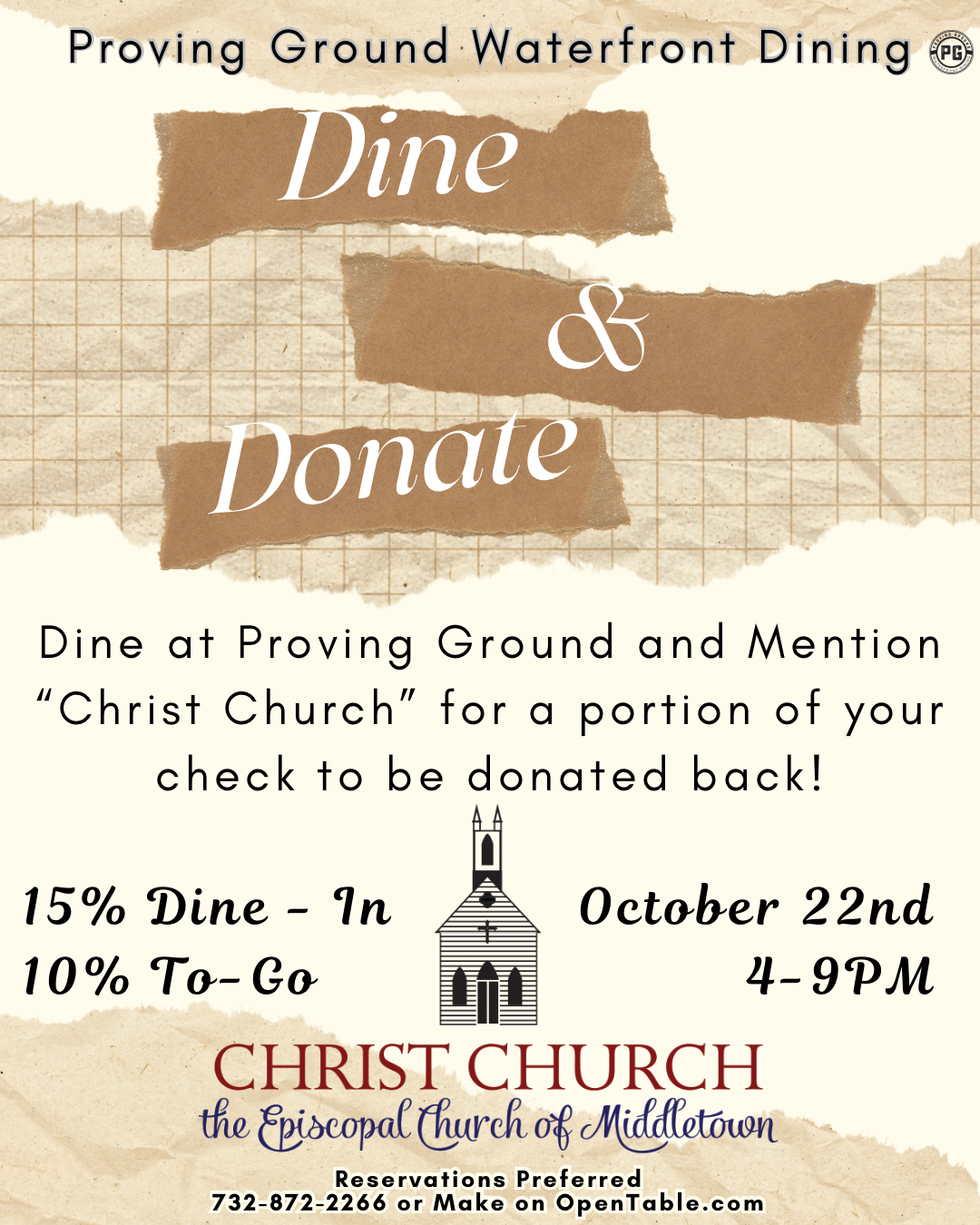 Dine and Donate - Christ Church Wednesday, October 22, 2025 4:00 PM 9:00 PM 16:00 21:00 The Proving Ground 56 Shrewsbury Avenue Highlands, NJ, 07732 United States (map) Google Calendar ICS